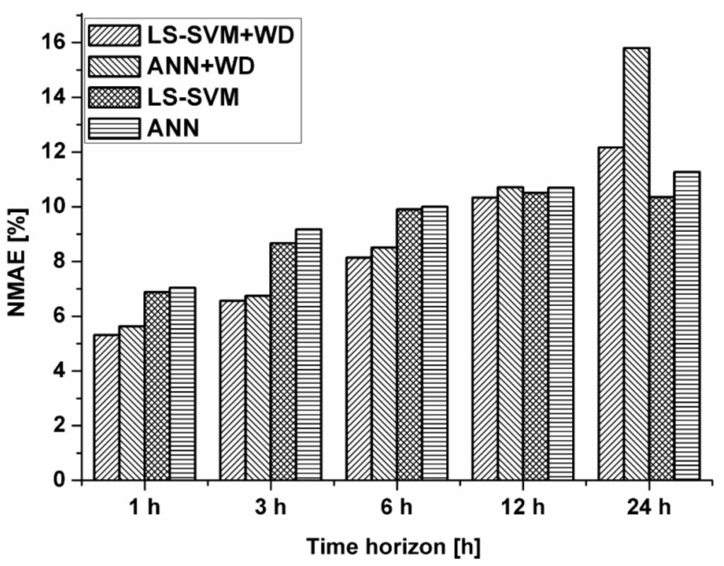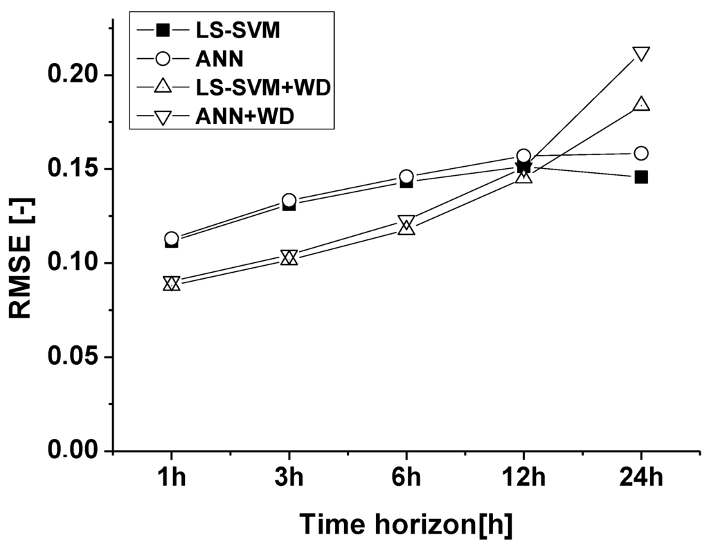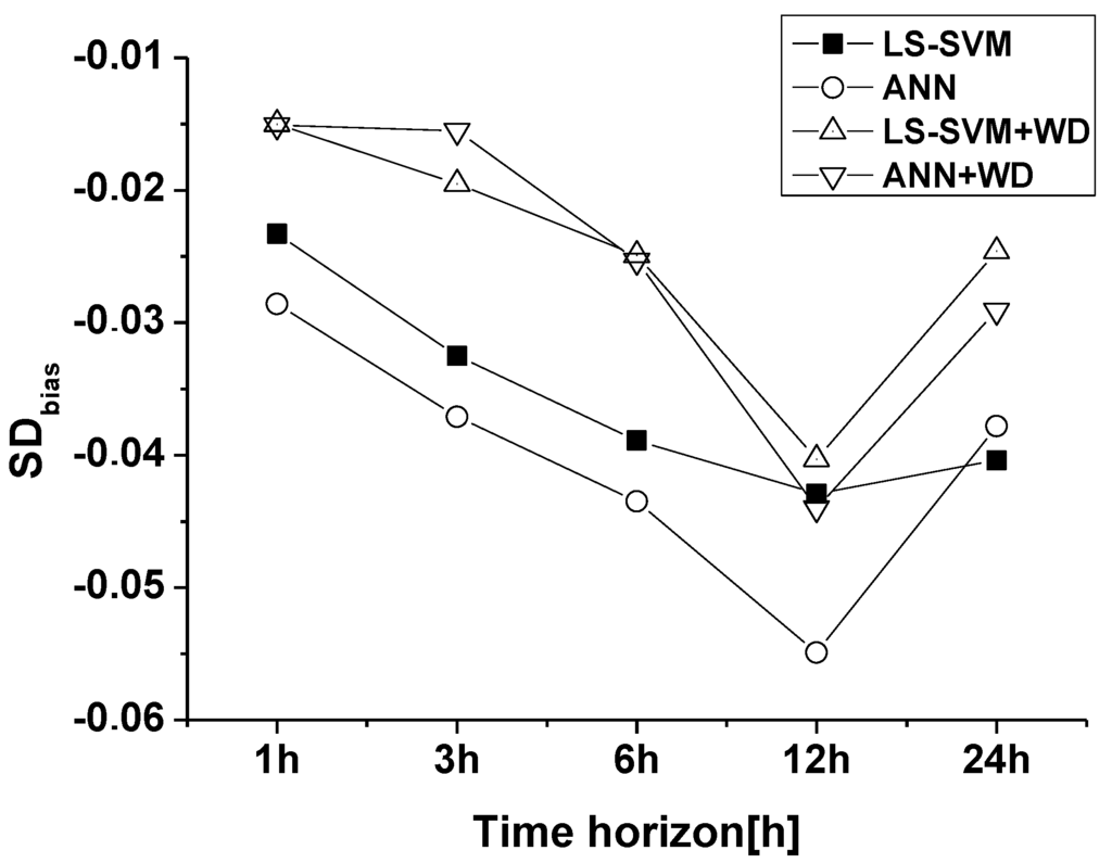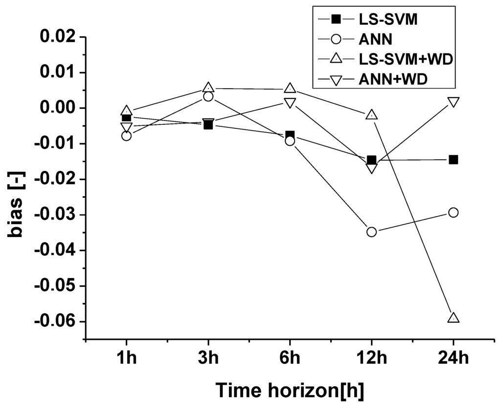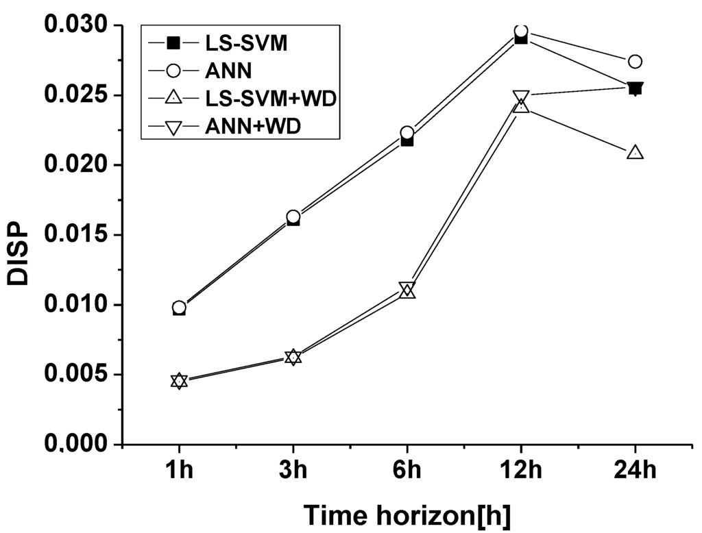 For the methods without WD, the DISP is in a rather narrow range of increasing linearly with the forecast horizon, from 1-h up to 12-h. A spread is evident among the methods without and with WD. The reduction in the phase error (DISP) is mainly due to the implementation of the Wavelet Decomposition rather than the choice of LS-SVM or ANN. Even if the use of LS-SVM allows a further decrease at the phase error 24-h.