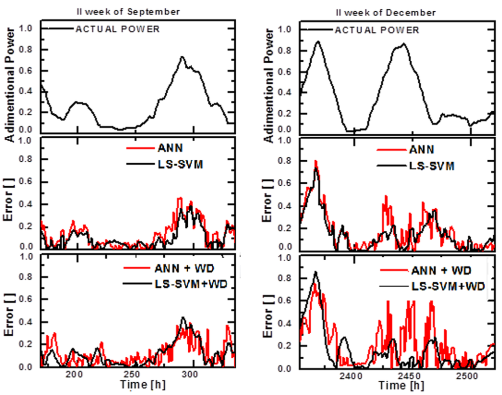 The decomposition of the root mean squared error into three contributions (bias, standard deviation bias and dispersion) provides a better understanding of the origin of the differences between prediction and measurement. The bias can be subtracted and increasing or decreasing the standard deviation of the prediction, contrary to the dispersion error, can adjust the standard deviation. Therefore, the reduction of the dispersion error constitutes the challenge for further improvements; hence forecasting methods with low DISP allows improvement in accuracy. The analysis showed that the reduction in the dispersion is mainly due to the implementation of the Wavelet Decomposition rather than the choice of the LS-SVM or ANN, even if the use of LS-SVM allows for a further decrease of the phase error at 24h.