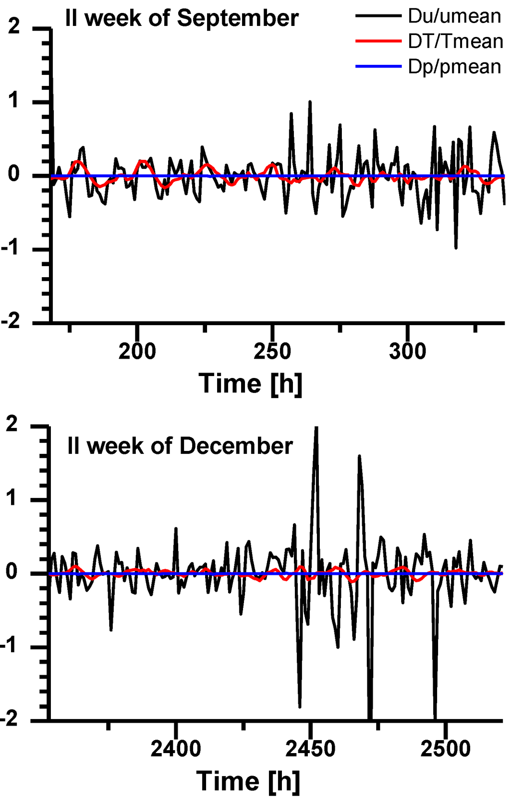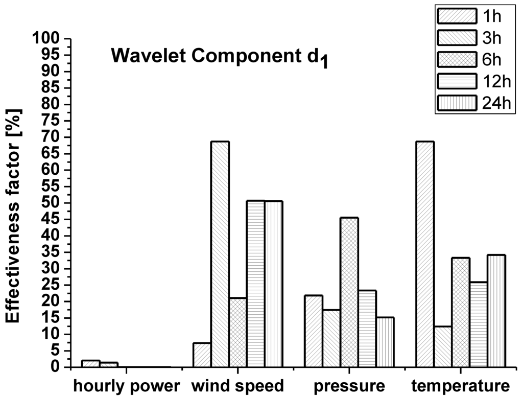 The results show that the NWP time series assume higher values of effectiveness factor for short and very short prediction lengths: in particular temperature for the component d1 that corresponds to high frequency 0.25–0.5 [1/h] and pressure for the component d3, frequency band 0.0625–0.125 [l/h]. The analysis also confirms the importance of the decomposition, which provides the input parameter with high frequency content, such as temperature, to have more weight in the training of ANN based on d1 detail component and the input parameter with low frequency component, such as pressure, to contribute more to the training of ANN based on detail component d3.