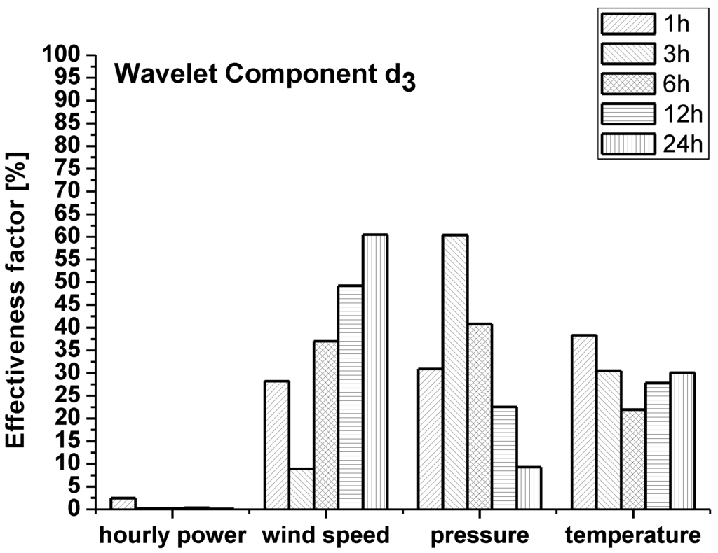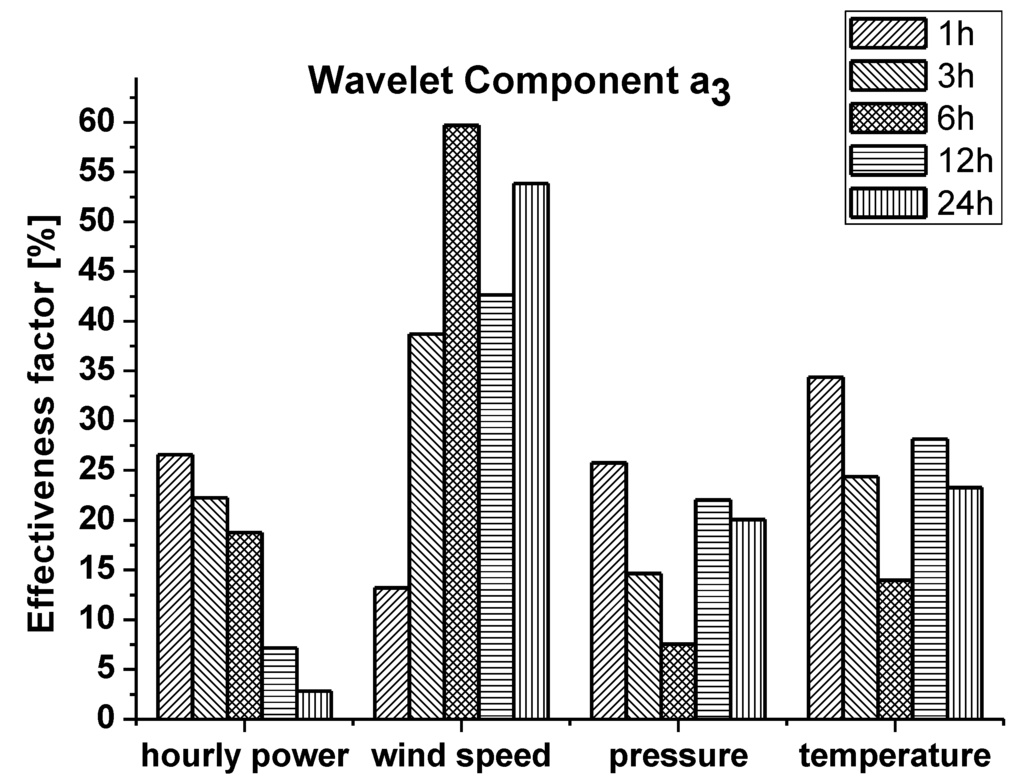 The results of the effectiveness factor for each variable, averaged for all five sites, are shown in Figure 12, Figure 13, Figure 14 and Figure 15. For the component a3 all input variables show the same behavior, in accordance with its characteristic to hold a generic trend of the original signal. A negligible influence of the measured power produced on ANN training is evident for the detail components, while NWP time series assume higher significant values, compared to a3 behavior, for short and very short prediction time lengths: in particular, the temperature for the component d1 and the pressure for the component d3, will exert a significant influence on the training of the ANN.