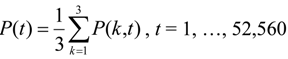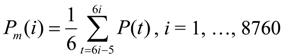 The average value of the power produced by the three wind turbines in the previous 60 min respect to the hour “i”. Given P(k,t) the wind power for each turbine in the instant “t”, recorded every ten min, the average value for the three turbines is: