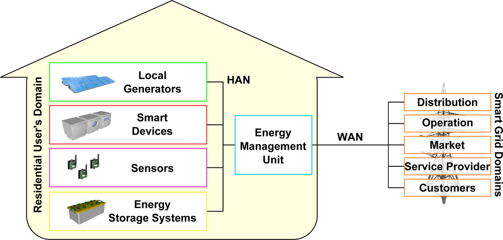 Smart grids (SGs) are the new generation of power grids, which have been introduced to address the main issues of traditional grids. Specifically, SGs can make grids more efficient and smarter by means of facilitating the deployment of renewable energy sources, decreasing oil consumption by reducing the need for inefficient generation during peak usage periods, optimizing resources utilization and construction of back-up (peak load) power plants and enabling the integration of plug-in electric vehicles (PEVs) and energy storage systems (ESSs) [6]. In order to properly design these new generation grids, a reference model has been defined, which consists of seven functional blocks, which are, namely, bulk generation, transmission, distribution, operation, market, service provider and customers [6]. The bulk generation domain generates energy by using resources like oil, coal, nuclear fission and RESs and stores electricity to manage the variability of renewable resources. The energy produced is dispatched through the transmission and distribution sectors, which are controlled by the operation domain. The balance between supply and the demand is guaranteed by the market domain, which consists of suppliers of bulk electricity, retailers who supply electricity to users and traders who buy electricity from suppliers and sell it to retailers and aggregators of distributed small-scale power plants. The service provider manages services for utilities companies and end-users, like billing and consumers’ account management. Finally, customers consume energy, but can also generate and store electricity locally. This domain includes residential, commercial and industrial customers, who can actively contribute to the efficiency of the grid.