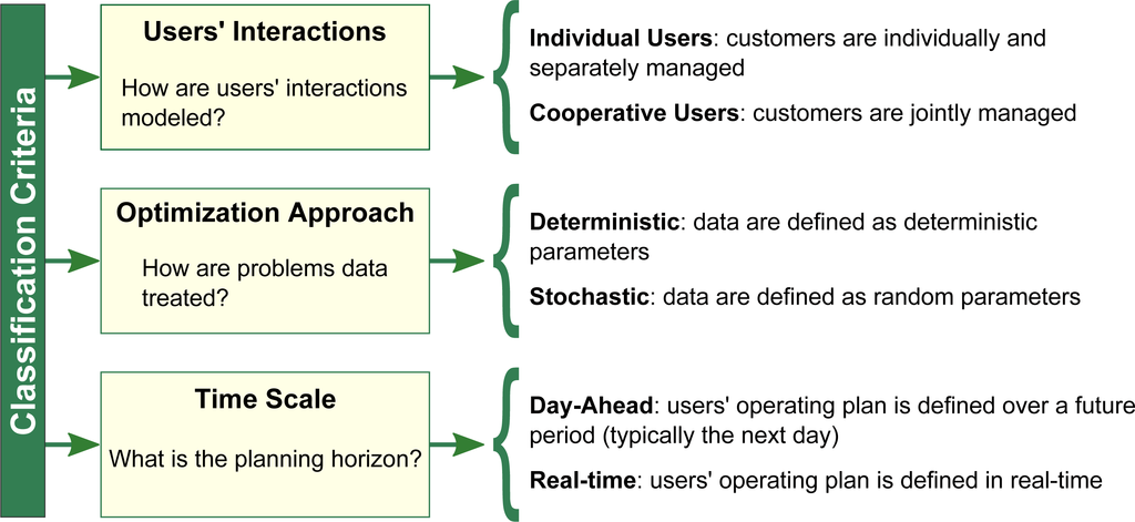 Finally, DSM systems can be classified based on the time scale used to manage the resources of customers: day-ahead and real-time. In the day-ahead stage, the operating plan of electric resources of users is defined over the next 24-h time period (or a different time horizon). To this end, DSM mechanisms require predictions/estimates of some parameters of the system, such as the energy generation of local sources, electricity prices and devices usage preferences for the next day. These data can be defined by learning algorithms executed by the EMU based on data provided by sensors, smart appliances or external sources (e.g., weather forecast used for RESs generation prediction). On the other hand, in the real-time stage, the users’ plan is re-defined based on real-time events and data. As a consequence, the demand-side management systems behave similarly to demand-response frameworks. Typically, real-time DSM methods are based on stochastic techniques, since they are usually designed to address the issue of the uncertainty of data.