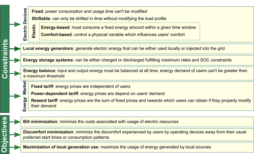 Demand management mechanisms can be designed to control the electric resource of individual users. However, this approach may have some undesirable effects [12]. In fact, consumers are characterized by a natural diversity in terms of appliance usage. This feature is fully exploited by the power system to optimize its efficiency in generating and distributing energy. Demand management mechanisms for individual users may actually disturb this diversity. In the case of systems for consumers’ payment reduction, for example, all users would shift their loads to periods of the day where the electricity prices are low. Unfortunately, this would determine large peaks of demand during such low-cost periods and, possibly, service interruptions (i.e., blackout or brownouts). To contain these unwanted side-effects, management mechanisms can be designed to control the community of users, thus managing their resources based on a system-wide perspective. Two different approaches are proposed in the literature to define these methods: optimization and game theory. In the first case, all consumers are supposed to cooperate in managing their resources, and optimization models are used to minimize a shared utility function. However, these solutions do not incorporate conflicts among users. In the case of real-time tariffs, for example, energy prices depend on the overall users’ demand, and one consumer’s actions directly affect the others in terms of costs. As a consequence, minimizing the overall bill may be unfair in terms of payment sharing among customers. In order to address conflicts, game theory is usually used, since it can model complex interactions among the independent rational players of the power grid [13].