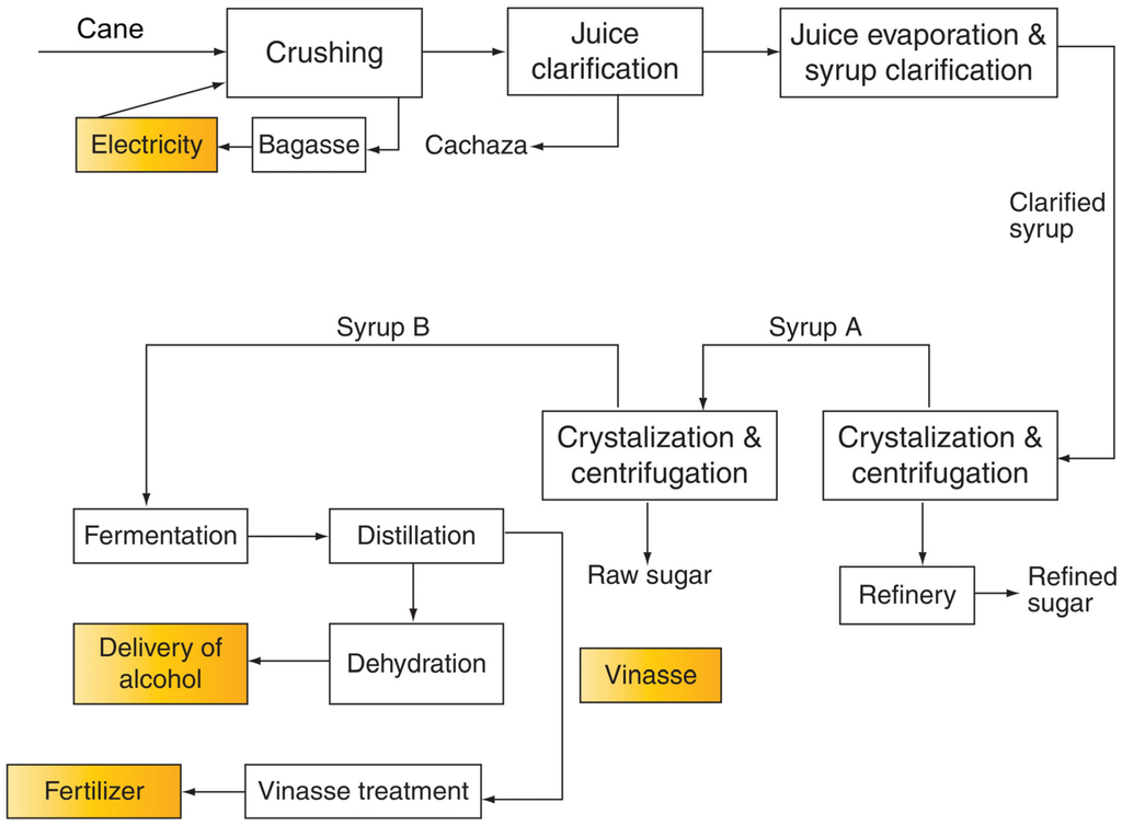 Fossil fuels have played a determinant role in the growth of economies since industrialization. They have led the primary energy mix of the world and will continue to lead it for the next years [,]. However, the rise of environmental issues due to the combustion of huge quantities of them, political concerns given by the instability of the countries where these sources are located, economic matters related to the increasing cost of oil, and the increasing awareness of their not supportable consumption rate have driven engineering into new research fields in order to move away from a fossil-dependent economy and industry to a more bearable form of development based on the use of renewable sources []. Historically, sugarcane plants, also called mills, have produced their own energy from biomass, which is in fact a convenient form of renewable energy. In sugarcane mills, a wide range of products can be extracted from the cane. Once the cane is milled, the juice and the fiber are separated. The fiber (bagasse) is burnt in the boilers in order to generate electricity and steam to supply the plants requirements while the juice is the feedstock for the production of sugar and first-generation bioethanol.