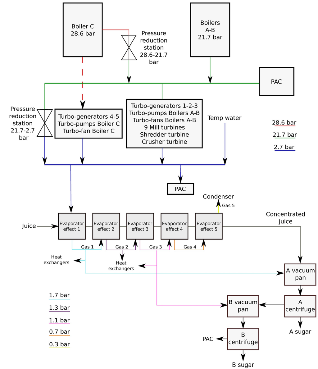 The plant is equipped with 23 turbines, operating on the two available enthalpy drops and supplying energy to different equipment. The head of 28.6 bar feeds five turbines for electrical power generation, the turbines that run the turbo-pumps of Boiler C, and the turbine of the fan of the same boiler. All the other turbines are connected to the head of 21.7 bar. There are turbines joined to the pumps and fans of Boilers A and B, turbines used to move the mills, the shredder, and the crusher. At the exit of all the turbines, steam is at the pressure of 2.7 bar, which is maintained through the addition of tempering water at saturated vapor condition. The head of 2.7 bar provides most of the steam for the heat requirement of the sugar and ethanol processes. Part of the ethanol distillery (PAC (Planta de Alcohol Carburante, which means Fuel Alcohol Plant) in Figure 2) and some equipment of the sugar plant, like the drier, are fed with steam from the head of 21.7 bar. The circuit of steam is provided by two pressure reduction stations that laminate the steam from 28.6 to 21.7 bar, and from 21.7 to 2.7 bar. Since the plant is not connected to the electrical grid, all the electrical energy produced is internally consumed.