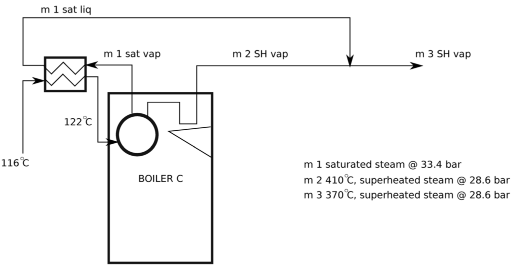 - Pressure of Boiler C saturated steam: pBc-sat = 33.6 bar;