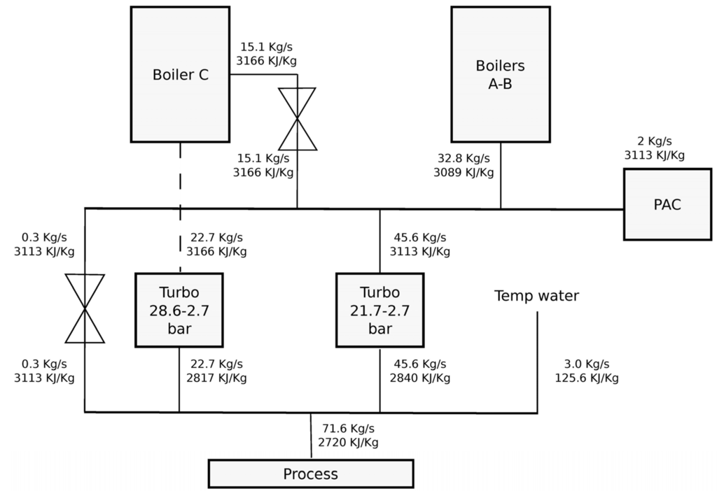 The reduction in steam pressure from 28.6 to 21.7 bar (mVAP-R28) is almost constant at different milling rates because, due to its higher efficiency, Boiler C is kept at full capacity (capBc) and the steam requirement of the head of 28.6 bar is almost constant too. Then, the steam flowing to this reduction station is given by the subtraction of this head requirement (mVAP-N28) from the Boiler C capacity (Equation 9). The production on Boilers A and B (mVAP-B-ab) then covers the other part of the 21.7 bar demand (mVAP-N21) which is given by the requirement of the 21.7 bar turbines (mVAP-TURB21), the steam flowing through the reduction station, and by the PAC’s requirement (mVAP-PAC). Equations 9 to 11 provide the steam mass balance at pressure reducer at Boilers A and B, while with Equation 12 the energy balance on the 21.7 bar head is computed: