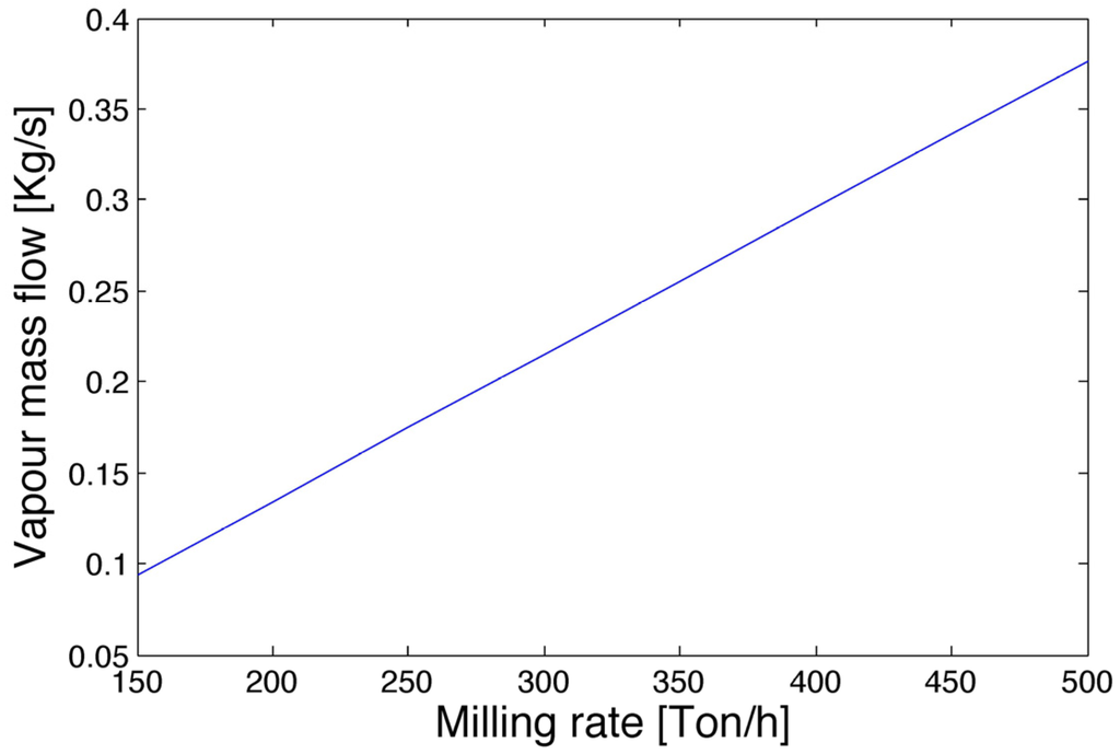 The total steam requirement of the plant as a function of the milling rate is known because the steam mass rate at the outlet of boilers is measured. Equation 3 expresses the steam need (mvap), which is translated into heat power need Qneed of the whole plant with Equation 4: