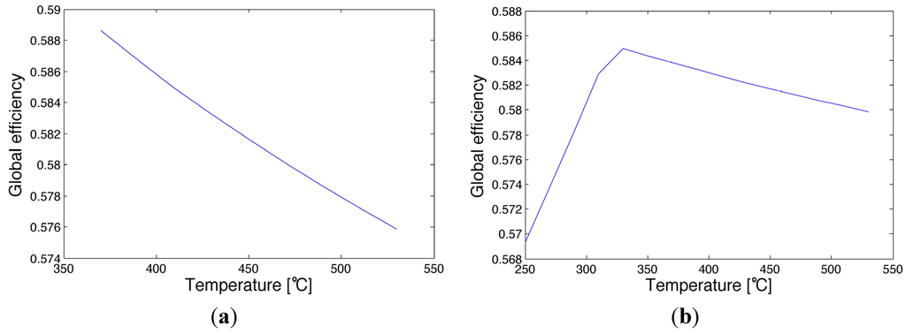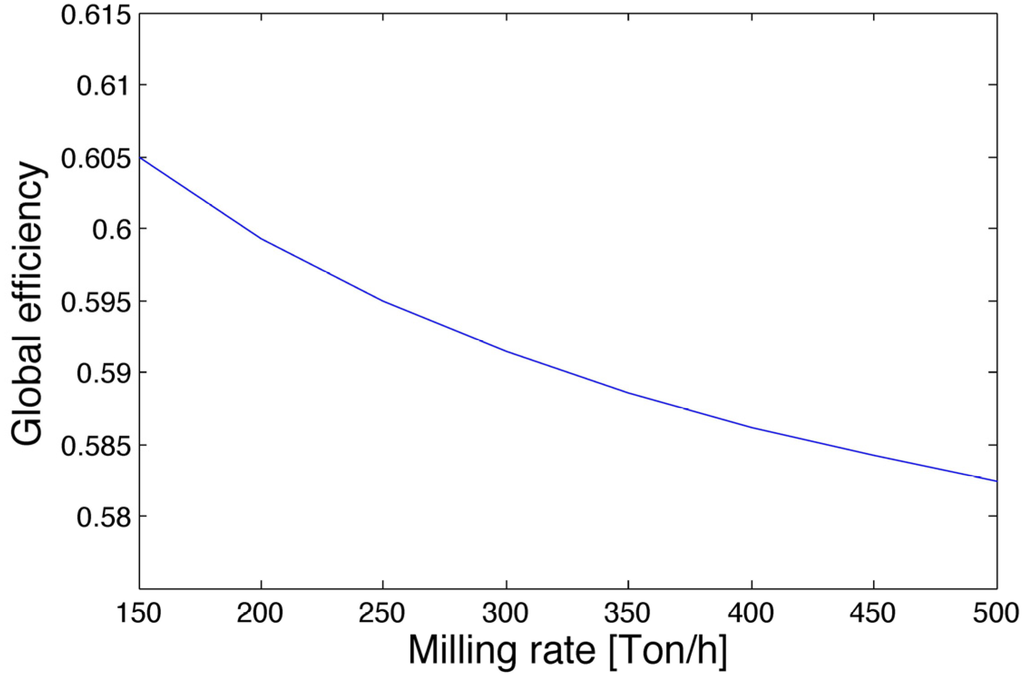 The plant performance is related to the milling rate. The following two figures focus on the global efficiency and on the steam mass rate flowing through the 21.7 to 2.7 bar reduction station. Figure 5 shows that the steam mass rate, which undergoes this pressure reduction, increases with the milling rate. While increasing the milling rate, the heat demand of the process cannot be covered by the steam flowing through the turbines (and covering mechanical and electrical needs), and additional steam has to be processed through the 21.7 to 2.7 bar steam reduction station to guarantee the required steam mass by the process. This implies an increased loss of energy that represents a process weakness. Moreover, the increase of the steam mass rate based on the reduction raises the specific enthalpy of the 2.7 bar head. This head has to be kept in saturated steam. Then more tempering water has to be introduced into the head, causing a greater energy loss. The trend of the global efficiency is strongly affected by the steam mass rate through the reduction station, as shown in Figure 6. The selected logic for the modeling of the cogeneration implies that the steam mass rate reduced from 28.6 to 21.7 bar is constant with respect to the milling rate. Since the main part of electrical power required is not related to the production, even at very low or high milling rates the turbo-generators 4 and 5 produce the same power, because they are asked to work at a fraction of their nominal power. Moreover, as previously defined, the turbo-pump and turbo-fan of Boiler C are modeled as constants. Boiler C is working at constant full capacity at each milling rate, the steam mass rate required by the 28.6 bar turbines is constant, and then the mass flow through the 28.6 to 21.7 bar steam reduction stations remains constant.