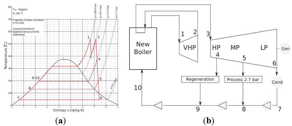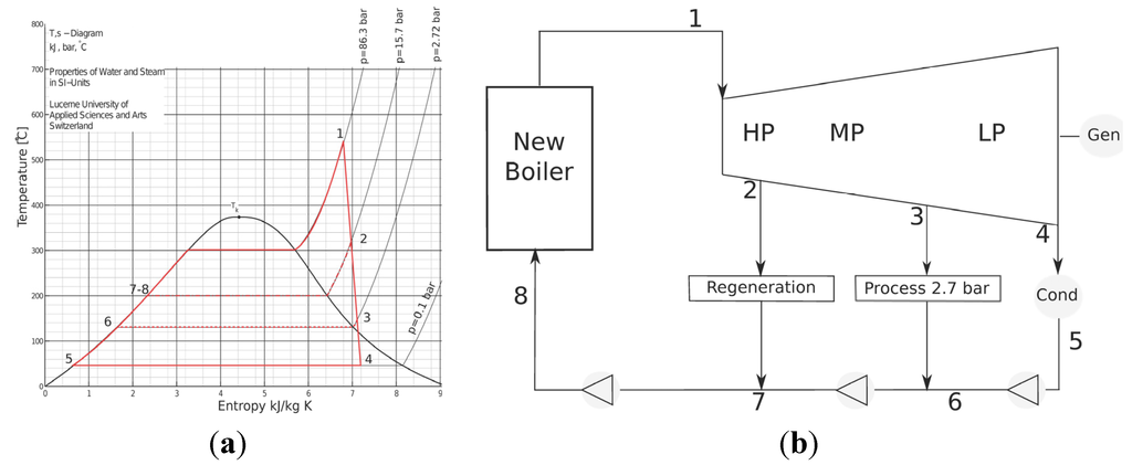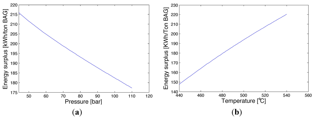 Sugarcane-based industries cogeneration boilers are fed mainly with bagasse. Boilers are coupled to backpressure or condensing-extraction turbines, the aim of which is to supply steam and electrical energy [,]. Backpressure turbines are the cheapest options in terms of initial investment, and the high enthalpy steam produced by the boilers is expanded until the pressure required by the process is reached. However, this solution presents some disadvantages. The electrical energy surplus fluctuates in relation to the cane supply and the process demand of steam. Condensing and extraction steam turbines allow processing of all the possible feedstock, but only a part of the generated steam is extracted (at a selected point of the expansion) and sent to the industrial process, while the remaining is further expanded and condensed. The electrical output is maximized because it permits the expansion of steam until the minimum pressure is reached in the condenser. Following this route, a more constant electrical energy surplus can be produced. Actual boilers and turbines are operated in the pressure range from 15 to 105 bar, corresponding to a temperature range of 300 to 525 °C.