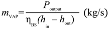 Given the power of the turbines (Poutput), the blade to shaft efficiencies ηBS, and the thermodynamic points at which they work (hin, hout), steam mass rates (mvap) are calculated with Equation 5: