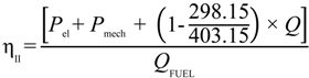 Now it is possible to compute the second principle efficiency (ηII) and the loss of energy related to critical steps. The ηII in the steady-state current condition is equal to 19.62%. Equation 22 shows how to calculate ηII, where Pel stands for electrical power, Pmech for mechanical power, Q for useful heat power, and QFUEL is the fuel energy input.