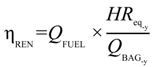The “Renewable Efficiency” (ηREN) of the plant can be defined as the amount of energy produced in a renewable way with respect to the total energy required by the plant. Since bagasse represents 31% of the total cane weight, and its mean LHV (7984 kJ/kg) is known, it is possible to calculate the instantaneous bagasse flow (mBAG), the yearly bagasse production (mBAG-y), and the renewable efficiency, as shown in the following equations, by introducing the concepts of year equivalent hours HReq-y, bagasse yearly available heat power QBAG-y: