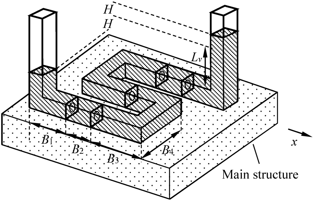 where the total mass of liquid in device is md; the density of liquid is ρd; the acceleration of gravity is g; the cross-sectional area of liquid column is Ad; the head loss coefficient is hd; the mass of the main structure is Ms; the damping of main structure is Cs; the total stiffness of main structure is Ks; the external excitation is F(t); t the vertical length is Lv, the horizontal length of the L-shaped column is B1; the length of the linear type column is B2; half the length of one side of the S-shaped column is B3; and the lateral length of the S-shaped column is B4.