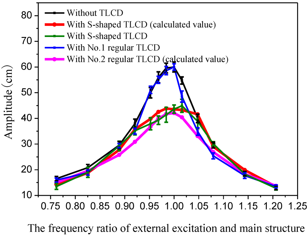The S-shaped TLCD in Figure 3 is the simplest form with two U-shaped columns. The shaking table (natural period is 1.9 s) in the experiments produces a large amplitude motion. The response of the shaking table with or without dampers is presented in Figure 4 with different frequency ratios of excitation and shaking table.