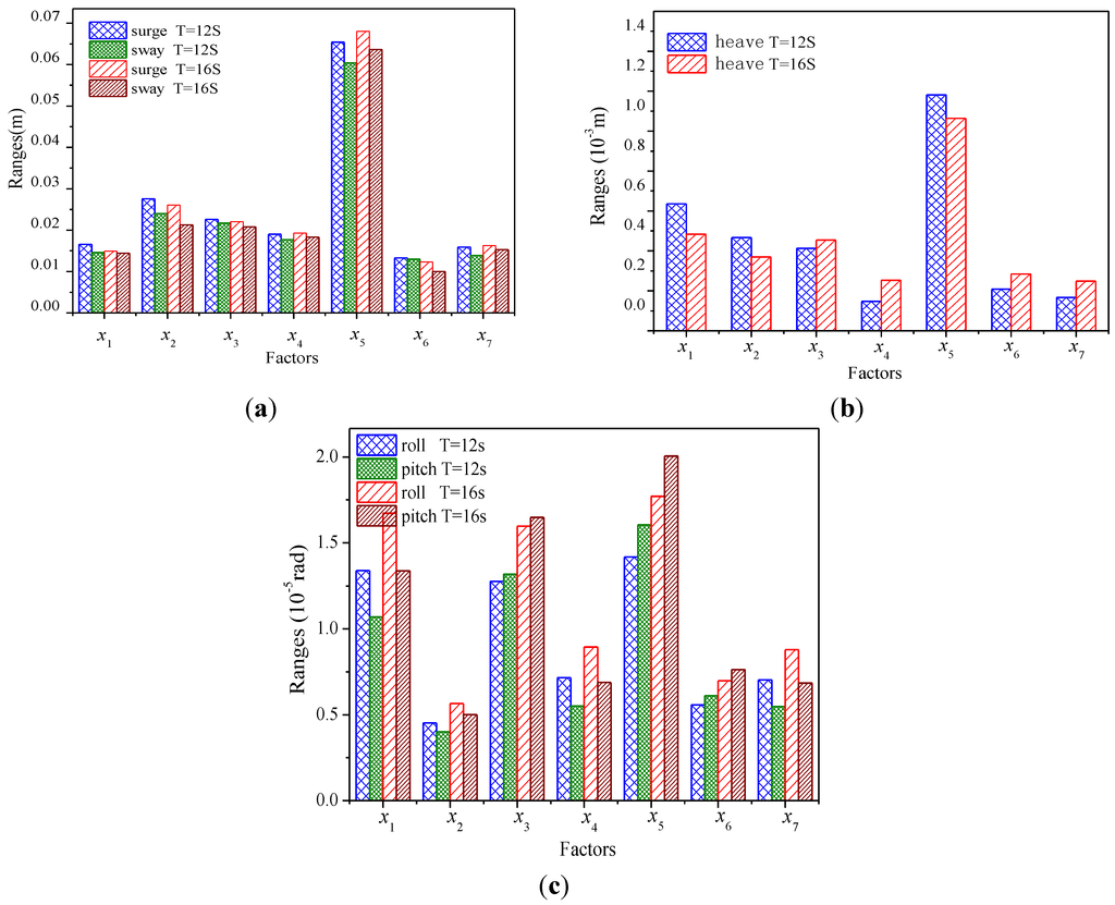 Range analysis of surge, sway, heave, pitch, roll for (a) surge, sway; (b) heave; (c) roll, pitch.