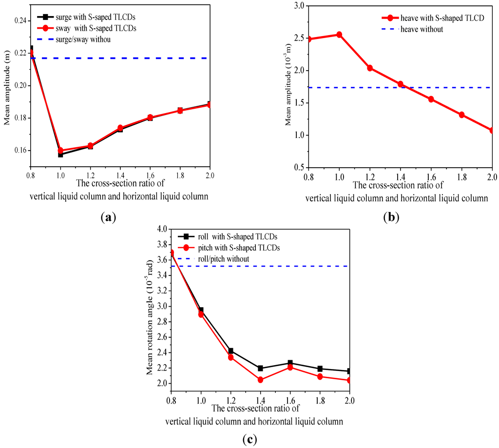 In conclusion, the study demonstrates the applicability of the novel S-shaped damper for motion suppression in deep-sea floating platforms. The S-shaped damper needs less than half of the horizontal length to provide the same suppression as a regular U-shaped damper. Though the S-shaped TLCD has less motion suppression effect than a regular TLCD for pitch and roll, the deteriorating effect on the heaving response can be controlled within acceptable limits. This is another advantage for installing S-shaped TLCDs on TLPs.