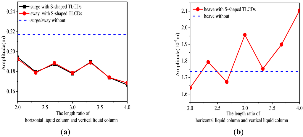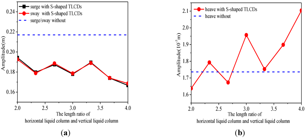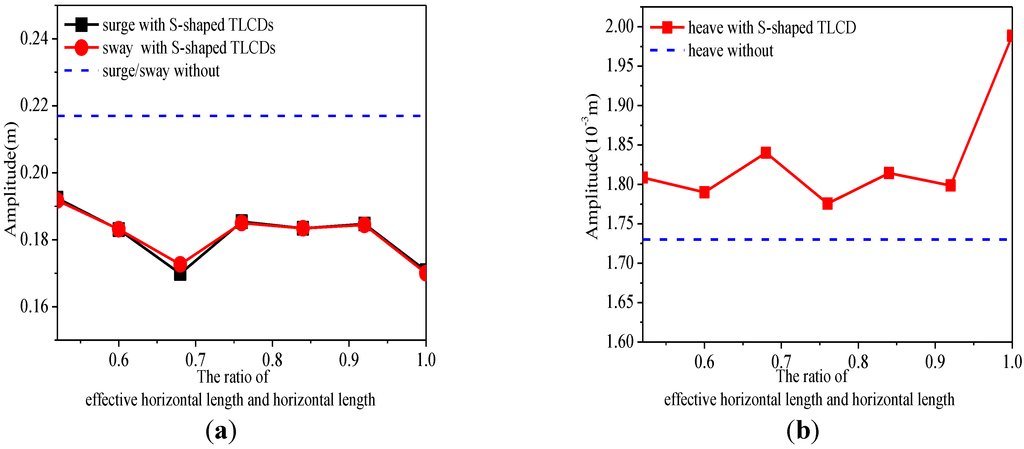 The factor x3 is the characteristic parameter for distinguishing an S-shaped TLCD from a regular one. As shown in Figure 8, an S-shaped TLCD can be changed into a regular TLCD at x3 = 1. For surge and sway, the suppression effect jumps between 13% and 22% with the change of x3. The suppression effect on pitch and roll is stable at 30%, when x3 varies from 0.7 to 0.9. After that, it sharply increases and reaches 45% at x3 = 1.0. However, Figure 8b shows that the heave response is in a state of deterioration. The deterioration effect of the heaving response is maintained between 3% and 7% at x3 = 0.5–0.9 and it exceeds 15% at x3 = 1.0. The results demonstrate that an S-shaped TLCD has a smaller deteriorating effect. In general, though an S-shaped TLCD has less motion suppression effect than a regular TLCD for pitch and roll, the deteriorating effect on the heaving response can be controlled within an acceptable limit by an S-shaped TLCD. Hence, this is another advantage for an S-shaped TLCD installed on a TLP.