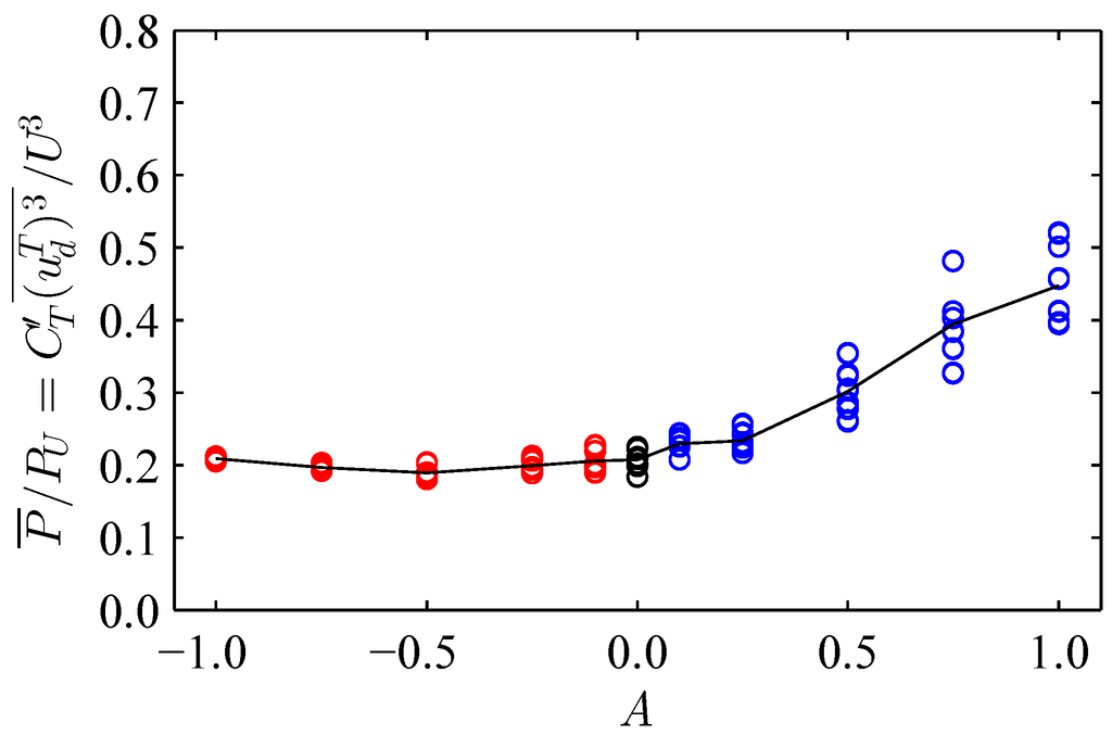Wind farm power production, normalized by power available in the high-altitude flow, is shown for each individual wind turbine (symbol) and for the wind farm mean (solid line) as a function of the forcing parameter A. Cases that correlated high-speed flow with upward and downward forcing are colored in red and blue, respectively.