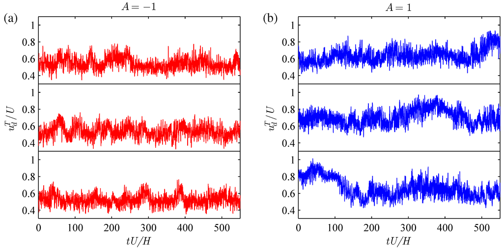 In addition to an increase in the mean power, however, we also see an increase in the spatial variation within the wind farm (indicated by the scatter in the symbols for the A > 0 cases). Since all of the turbines in the simulation are statistically equivalent, the variation in power among the wind turbines for large A > 0 indicates variations in power over time scales up to several hundred tU/H, which occur due to variations in the turbulent atmospheric flow. The cause of the long-time variations and the spatial variability is the presence of high- and low-speed streaks in the velocity field, which will be discussed in Section 3.2. The results presented here are averaged over 1500 tU/H, with the mean advection time between turbine rows as roughly 0.9 tU/H, which is not long enough to eliminate the effect of the streaks; this gives a sense of the time scales associated with the meandering of the streaks. As individual turbines pass into and out of the high- and low-speed regions of the flow, the velocity (and therefore power) fluctuates, as can be seen in the sample disk-averaged velocity time-series given in Figure 2. The power generated in the A = 1 case, presented in Figure 2b, shows significant long-time variations (order 100 tU/H) that are not present in the A = −1 case presented in Figure 2a.