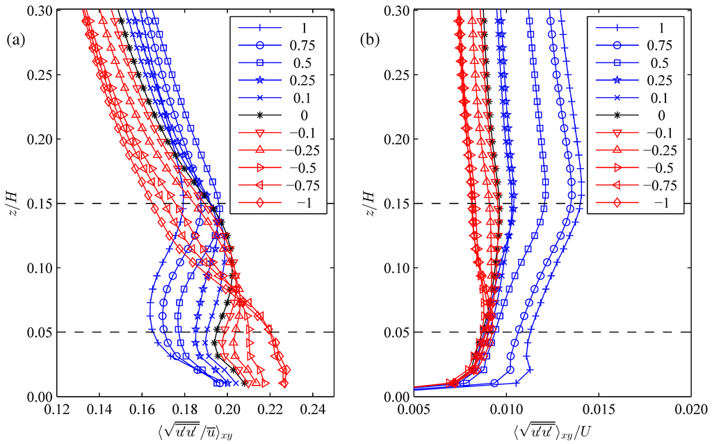 For each LES case, the driving non-dimensional pressure gradient and the height of the boundary layer H are the same, though in practice, the boundary layer height would vary with the effective roughness of the wind farm. The unconventional vertical forcing scheme changes the effective roughness of the wind farm, but the degree to which this occurs is impossible to predict a priori. Since we are unable to easily alter the domain height during the simulation and therefore opt to use a fixed height, the roughness change affects the bulk flow velocity with respect to the velocity scale up = and the height of the boundary layer H are the same, though in practice, the boundary layer height would vary with the effective roughness of the wind farm. The unconventional vertical forcing scheme changes the effective roughness of the wind farm, but the degree to which this occurs is impossible to predict a priori. Since we are unable to easily alter the domain height during the simulation and therefore opt to use a fixed height, the roughness change affects the bulk flow velocity with respect to the velocity scale up = To account for this change in velocity with respect to up, we normalize all results by the mean velocity at the top of the domain, U. One could alternatively run the simulation with a variable pressure gradient that enforces a given mean velocity (the same between all runs) at the top of the domain, but our post-processing approach is simpler and yields the same results.