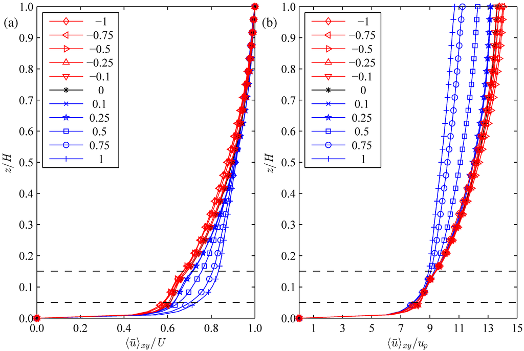 As can be seen in Figure 4b, the average velocity at hub-height (z/H = 0.1), measured in units of the pressure-forcing velocity scale, is independent of the forcing parameter A. The maximum variation in /up between cases is found to be 2%, small enough that the predetermined fixed threshold of
