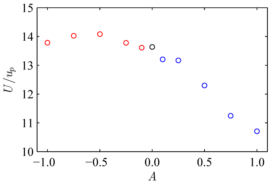 In Section 2.1, we discuss the presentation of the results in terms of the high-altitude velocity U , rather than the pressure-forcing velocity scale up. The relationship between these two velocity scales, for each of the forcing cases, is presented in Figure 5. For the A > 0 cases, the pressure-forcing velocityscale is larger compared to the high-altitude velocity, which corresponds to an increase in the height of the boundary layer or the magnitude of the pressure-forcing.