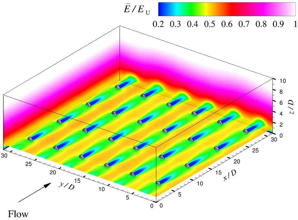 The power produced by the wind farm, on average, is a function of the MKE at the turbine hub height; in order to increase the wind farm power generation, the MKE at the turbine rotors must increase. The spatial variation of the MKE within the wind farm is shown in Figure 8 for the baseline A = 0 forcing case. The reduction in MKE in the turbine wakes corresponds to energy extraction at the actuator disks. The MKE also increases with the distance from the ground.