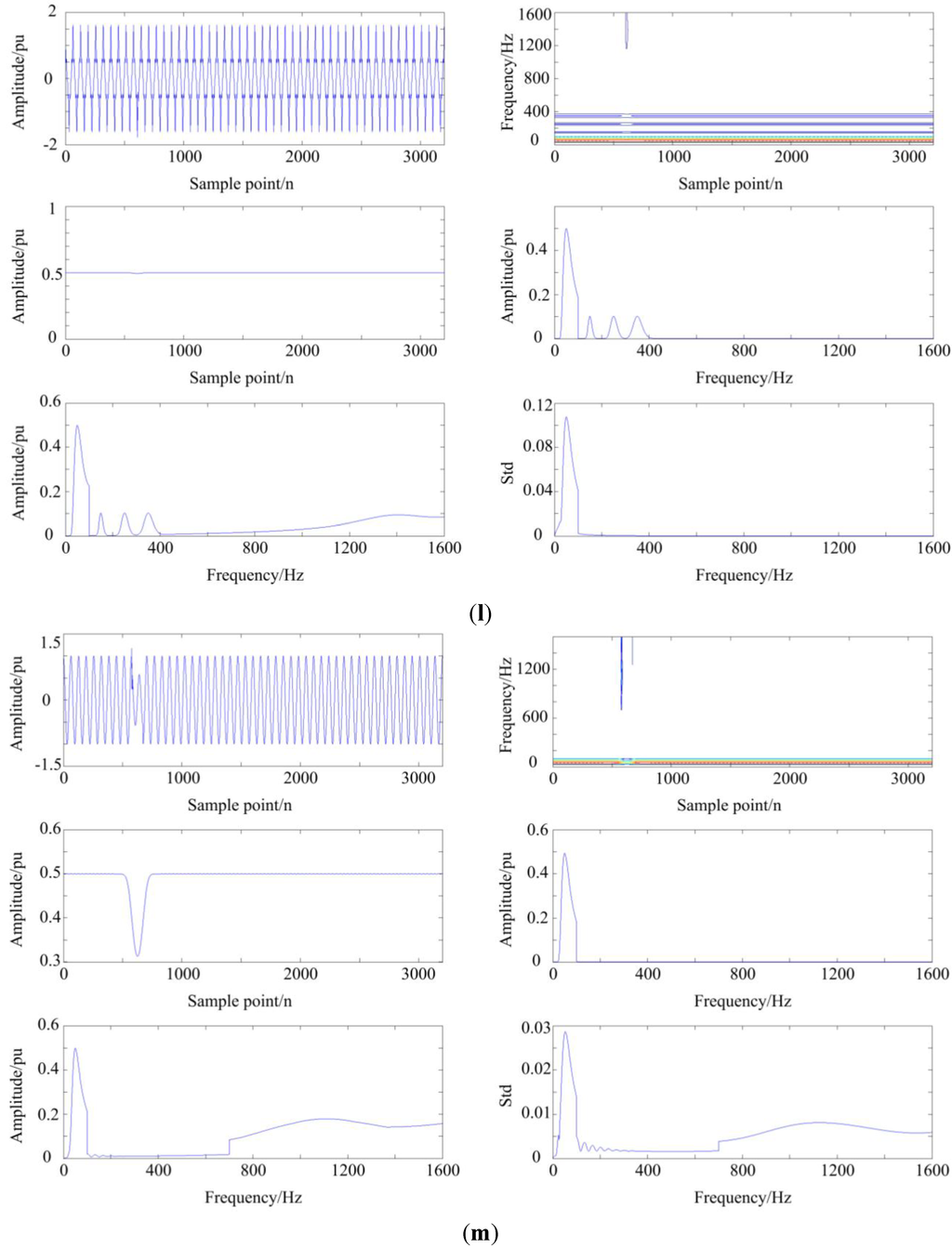 The MGST analysis of 13 disturbances: (a) sag; (b) swell; (c) interruption; (d) flicker; (e) transient; (f) harmonic; (g) notch; (h) spike; (i) harmonic with sag; (j) harmonic with swell; (k) harmonic with flicker; (l) harmonic with transient; (m) sag with transient.