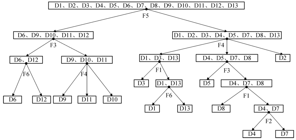 DT recognizes different PQ disturbances by turning a complex classification problem into some binary classification problems. It can be carried out easily and has a high classification efficiency [14]. As the disturbance samples concerned in this paper at each decision node can be differentiated by merely one feature, DT is undoubtedly the best choice.