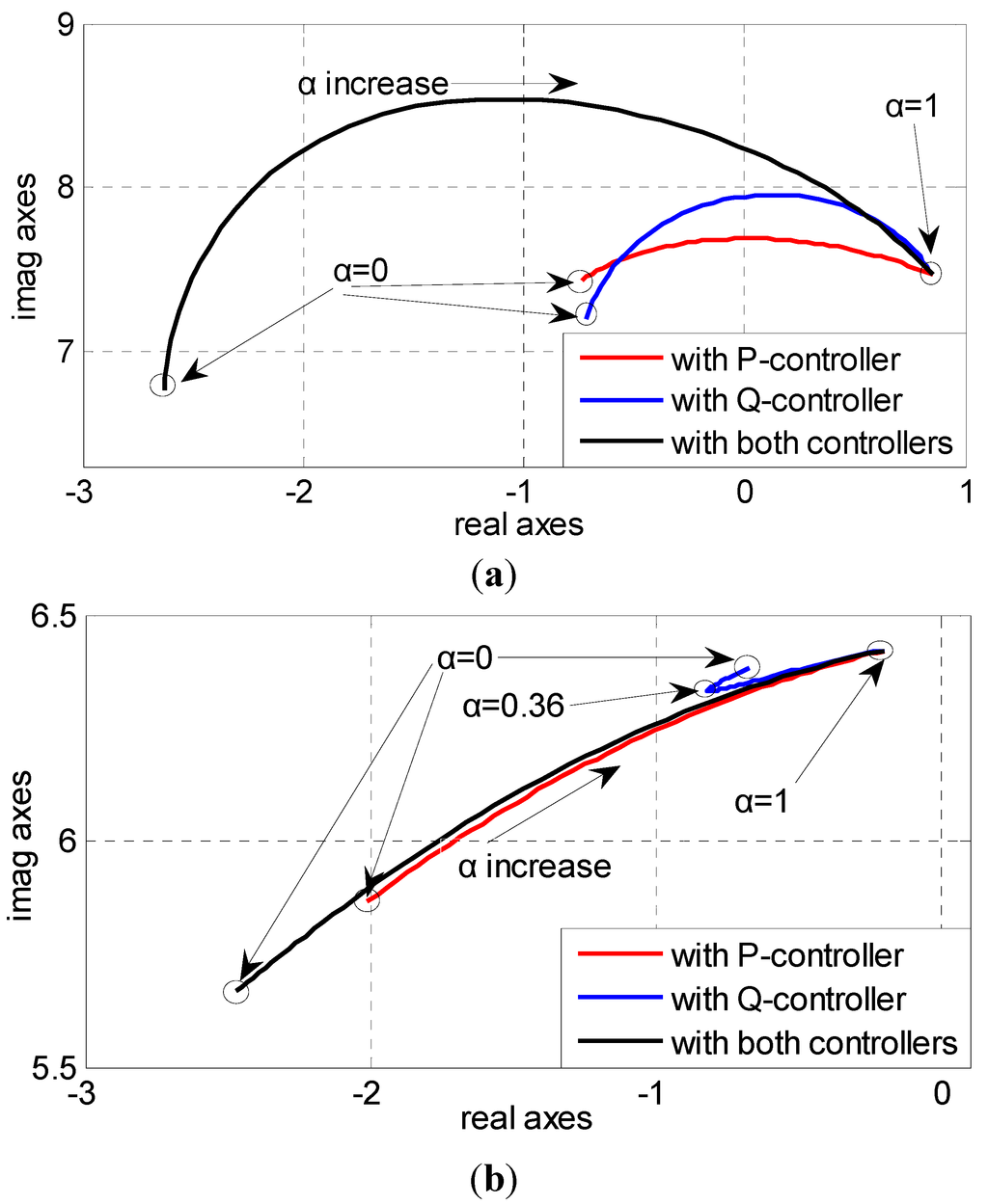 | P-controller and Q-controller with compensation | −2.36 ± j 6.13 | 0.46 | 1.0 | −2.70 ± j 6.79 | 0.4 | 1.08 | |