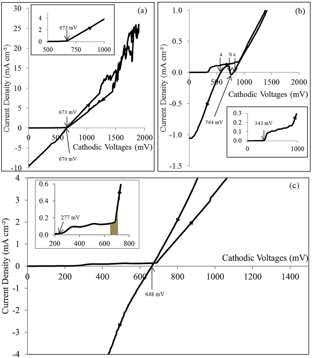 Cyclic voltammetry provides information on electric current flow in the electrolyte and results are obtained by measuring the current passing through the working electrode during the potential scans. Figure 1 shows a typical cyclic voltammogram of aqueous solutions of (a) 1.0 M CdCl2; (b) 1 mM TeO2; and (c) mixture of 1.0 M CdCl2 and 1 mL of prepared 1 mM TeO2 during the forward and reverse cycles between 0 and 2000 mV. The scanning rate was fixed at 3 mV·s−1 and the solution temperature was kept at 65 ± 2 °C.