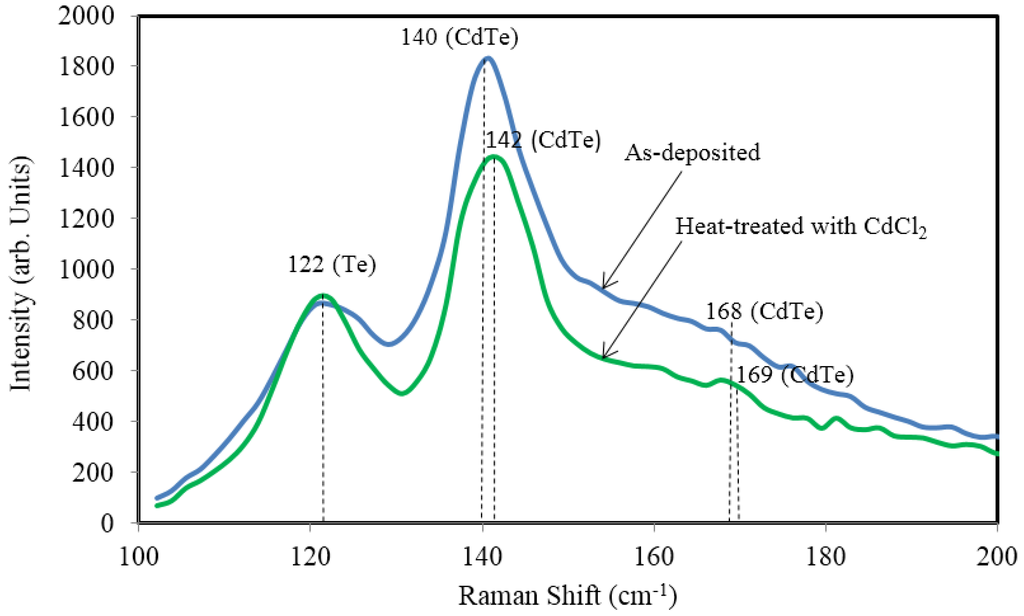 Raman spectroscopy is an alternative and convenient method to identify material phases and determine the degree of crystallinity of the thin films. In this technique, vibration, rotation and other low-frequency modes in molecules are observed based on inelastic scattering of monochromatic radiation. The excitation source used in this work was 514 nm argon ion laser. The Raman spectra for as-deposited and CdCl2 treated CdTe layers are shown in Figure 6. The prominent peak of the as-deposited CdTe spectrum is observed at the wave number 140 cm−1 which represented the CdTe fingerprint. The Raman shift increased from 140 cm−1 to 142 cm−1 after CdCl2 treatment. This blue shift is due to the energy gained by the photon by increasing in the vibration mode and the lattice strain. The FWHM of this peak also increase slightly after CdCl2 treatment. There are two possible effects influencing the FWHM of the Raman peak which are size effect and the lattice dislocation effect [30]. In this case, the size effect is more pronounce since we observed the enlargement in crystallite size after CdCl2 heat-treatment. This trend is similar to the previous XRD results. It is also observed from this figure a Te peak at wave number of 122 cm−1 and the peak increased intensely after the CdCl2 heat-treatment. The spectrum for CdCl2 treated CdTe also shows one appearance of a small hump representing a CdTe peak at 168 cm−1. This particular sample shows improved crystallisation of excess Te in the CdTe layer after CdCl2 treatment. The summary of the Raman analysis is presented in Table 3.