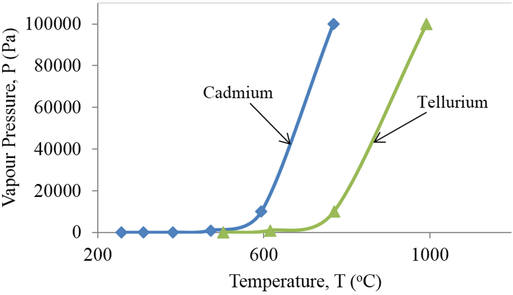 The vapour pressure of cadmium and tellurium as a function of temperature.