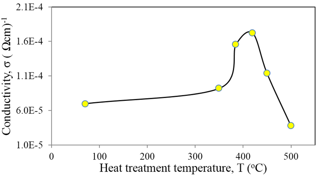 Table 5 summarizes the measurements of average resistances, resistivity and electrical conductivity of CdTe layers deposited near Vg = 698 mV (n-type) and heat treated with CdCl2 at different temperatures. Figure 10 shows that the value of electrical conductivity has increased from 6.97 × 105 to 17.19 × 105 (Ω·cm)−1 after heat treatment with CdCl2 at temperature of 420 °C. The conductivity enhancement is due to the improvement of crystallinity, enlargement of the grain size and re-distribution of dopants [33] which promote higher mobility of electrons. However, a decrease in conductivity was observed for the CdCl2 treated samples at annealing temperatures ≥450 °C. This must be due to the deterioration of the material at higher annealing temperatures and this trend also is consistence with the material deterioration observed in both XRD and PEC analyses in previous sections.