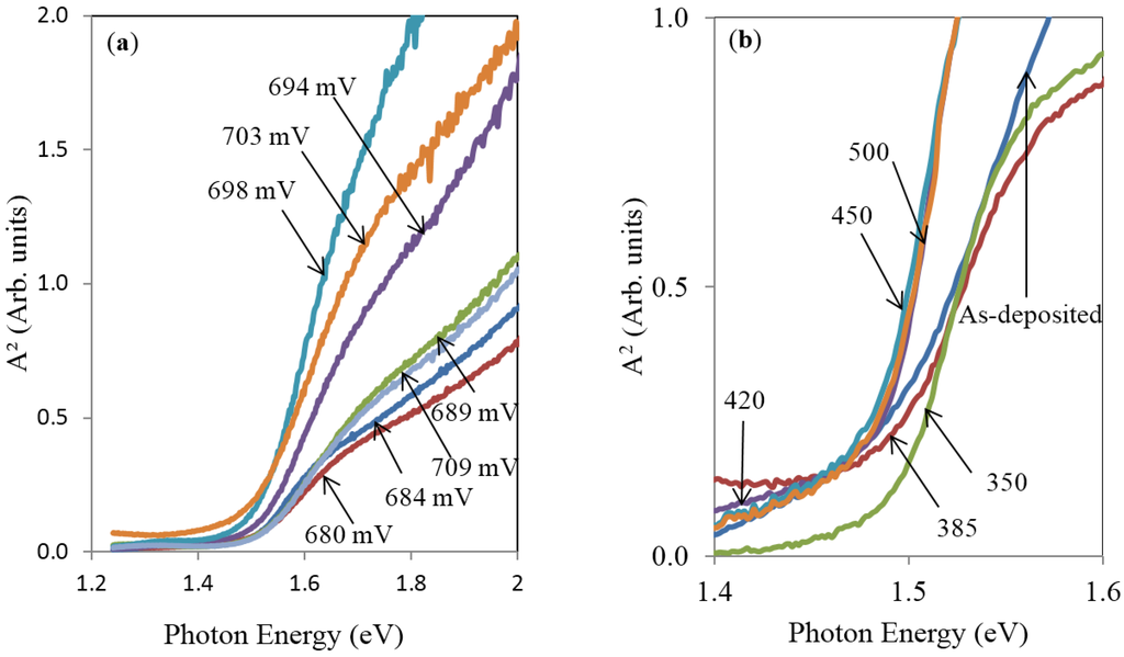The optical absorption measurements of the CdTe layers were carried out using a UV-Vis spectrophotometer in the wavelength range 600–1000 nm. The square of absorbance (A2) has been plotted as a function of photon energy, and the bandgap energy was estimated by extrapolating the straight-line segment of the graph to the photon energy axis. Figure 13a shows optical absorption of the as-deposited CdTe thin films grown at different cathodic voltages from 680 to 709 mV. It is observed that the bandgap energy of as-deposited CdTe films was in the range of 1.48 to 1.51 eV. The average error of these measurements is ±0.02 eV. The graphs in Figure 13a and Figure 14 show that the trend of applied absorption edge is increased with Vg up to 698 mV and then gradually reduces with further increment of Vg. The reduction of bandgap with higher Vg is due to deposition of metallic Cd with zero bandgap. Figure 13b shows the optical absorption spectra of CdTe thin films heat treated at temperatures from 350 to 500 °C in the presence of CdCl2.