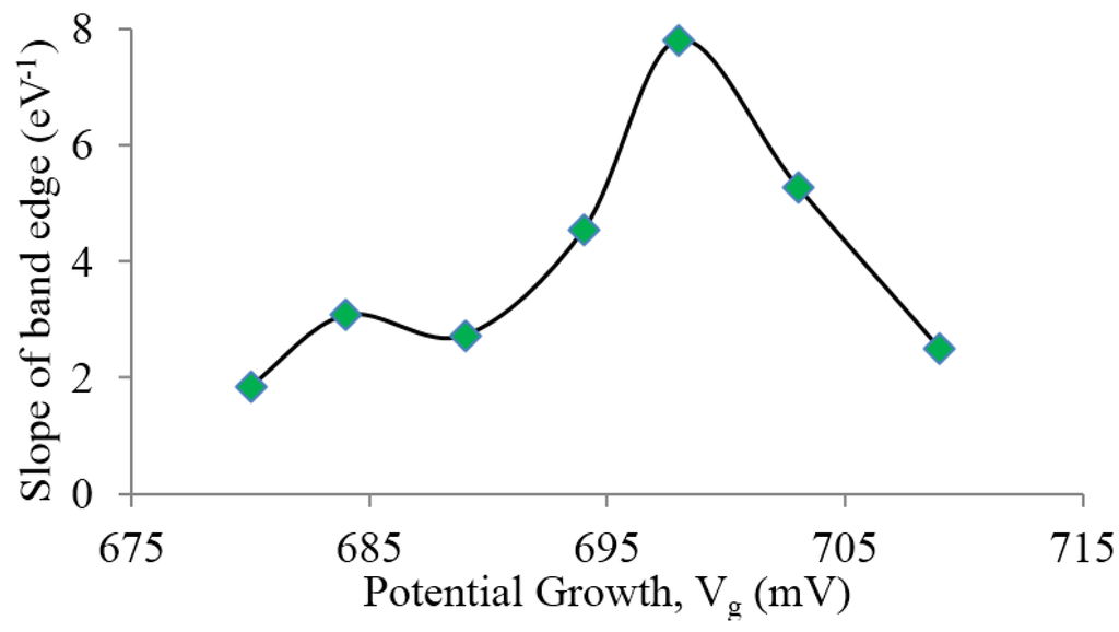 Slope of band edge versus Vg for as deposited CdTe thin films. Highest absorption edge indicates the optimum growth voltage.