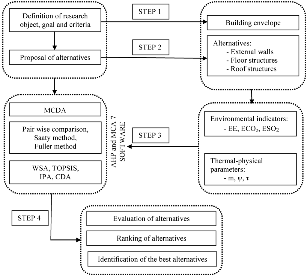 The flowchart of the research work (Figure 1) introduces the sustainability assessment approach applied to achieve the research objectives. Step 1 indicates the research object, goal, main criteria, and sub-criteria. The research object is non-transparent structures of the building envelope of nearly-zero-energy wooden houses. The focus is on energy and the environmental impacts of building structures. Step 2 is the proposal of alternatives. There are 60 proposed alternatives for external wall assemblies, 51 alternatives for above-the-ground floor structures, 10 alternatives for on-the-ground floor structures, and 55 alternatives for roof structures for evaluation by MCDA. Step 3 is the prioritization of the criteria/sub-criteria, using pair-wise comparison with Saaty’s evaluation scale. Decision-making software based on Analytic Hierarchy Process is used. Step 4 is intent on evaluation and ranking of alternatives of nontransparent structures of building envelope. Finally the best alternatives of building structures were identified and recommended for nearly-zero-energy wooden houses.