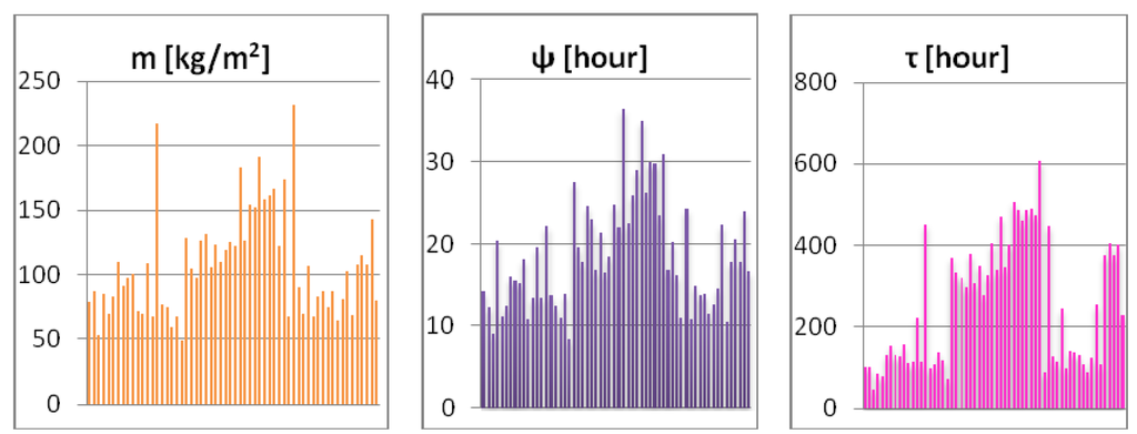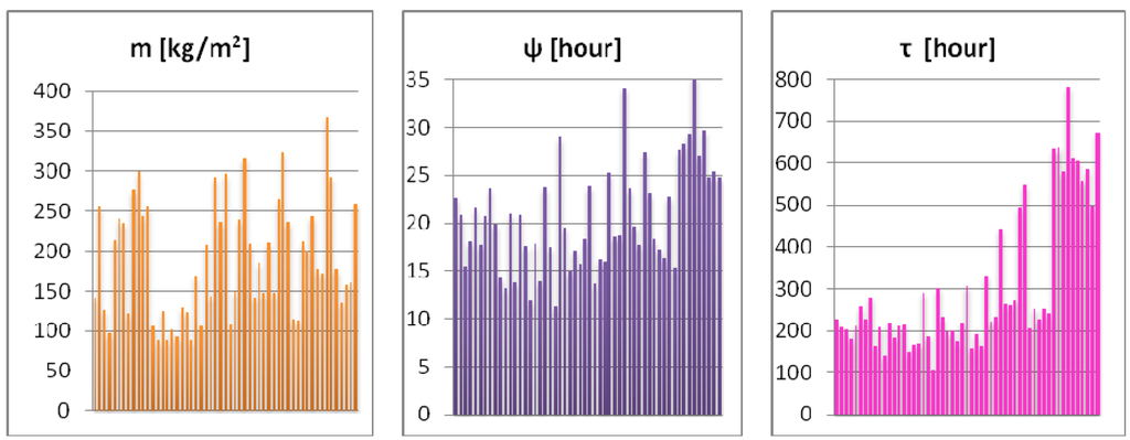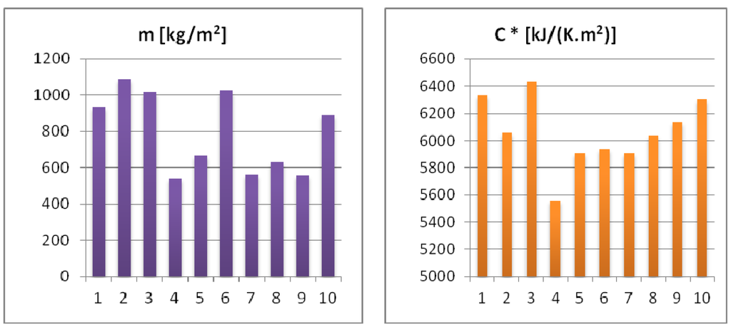 Figure 2 illustrates the differences in values of mass per unit area, phase shift of thermal oscillation, and relaxation time for external wall designs.