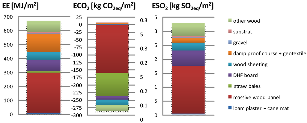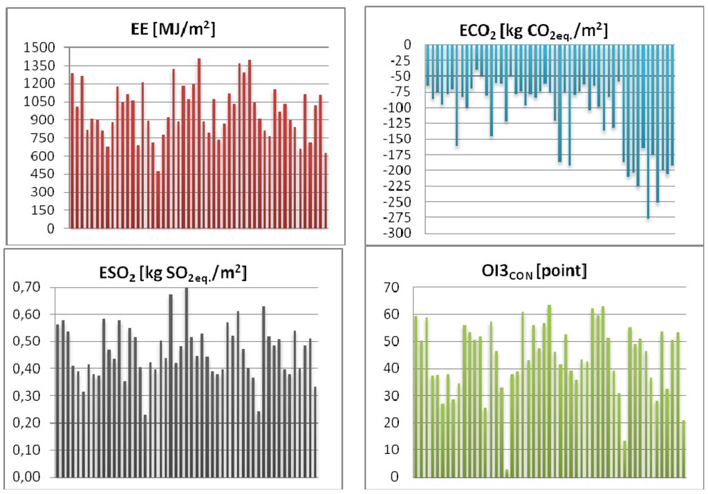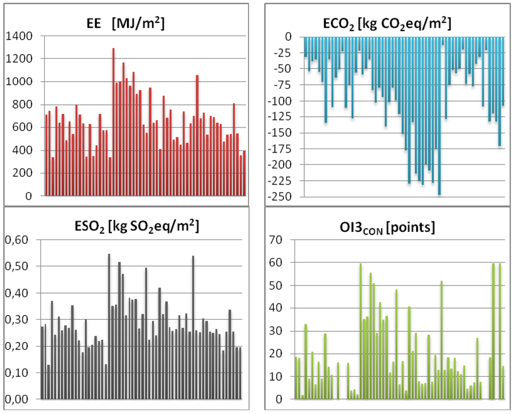 Environmental performance of material solutions is calculated by using the LCA assessment method within “cradle to gate” boundaries according to the recommendations of EN 15804:2012 [37]. LCA is a standardized tool used to assess and report relevant environmental impacts of a product’s life cycle. The LCA framework is interpreted in ISO series 14040-44 [38]. The analysis investigated the role of different building material compositions in terms of EE from non-renewable resources and emissions of CO2 and SO2 in nearly-zero-energy wooden houses. EE is the energy utilized during the manufacturing phase of the building materials and represents the energy used to acquire raw materials (excavation), manufacture, and transport. Similarly, emissions of CO2 (ECO2, global warming potential (GWP)) and SO2 (ESO2, acidification potential (AP)) represent the equivalent emissions within the LCA “cradle to gate” boundaries and, for plant materials, takes into account CO2 absorbed during the growth stage. The carbon stock is taken into account in the calculation of CO2 emissions. Input data for environmental indicators were extracted from the IBO Ecological Construction Component Catalog of the Austrian LCA database [39]. In this study, the environmental indicator ΔOI3 is also calculated. The ΔOI3 indicator for a particular building material layer indicates by how many OI3 points that layer of building materials raises the OI3CON of a structure. In other words, if we eliminate one layer from a structure, the OI3CON of the structure will decrease by ΔOI3 points [40].