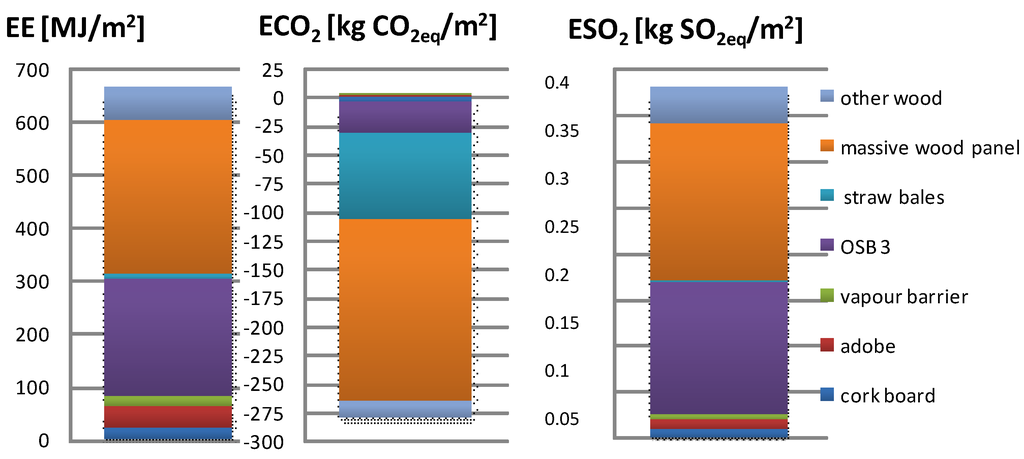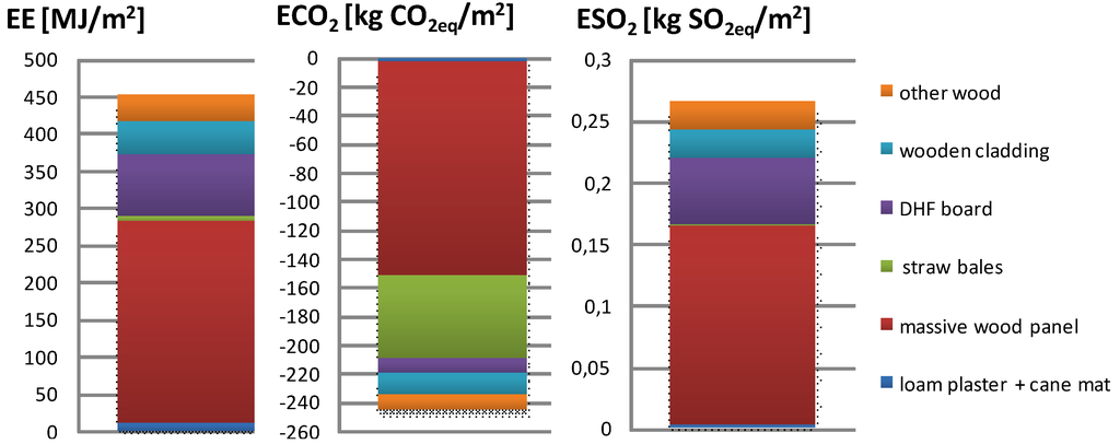 The aim of the present study is to analyze implementation of sustainable principles in the material-selection, decision-making process. The analysis investigates the role of different building materials in the composition of non-transparent structures of building envelopes in terms of the EE and equivalent emissions of CO2 and SO2. Proposed material compositions are designed to be meet the recommended heat transfer coefficient value of U = 0.15 W/m2·K for nearly-zero-energy wooden houses. Environmental performance of material solutions is calculated by using the LCA assessment method within “cradle to gate” boundaries. The main contribution of the study is underlining that natural materials have a significant part in the reduction of environmental impacts.