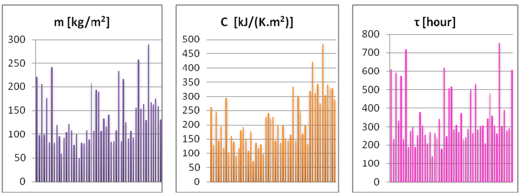 Most of the aspects were calculated using Svoboda-Area 2009 software according to STN EN 730540:2012. The mathematical calculation of the relaxation time is explained by Equation (1), which depends on the order of material layers. It assigns the ability of the structure to stabilize the inertial temperature during stationary cooling (after turning the heating off) [36]: