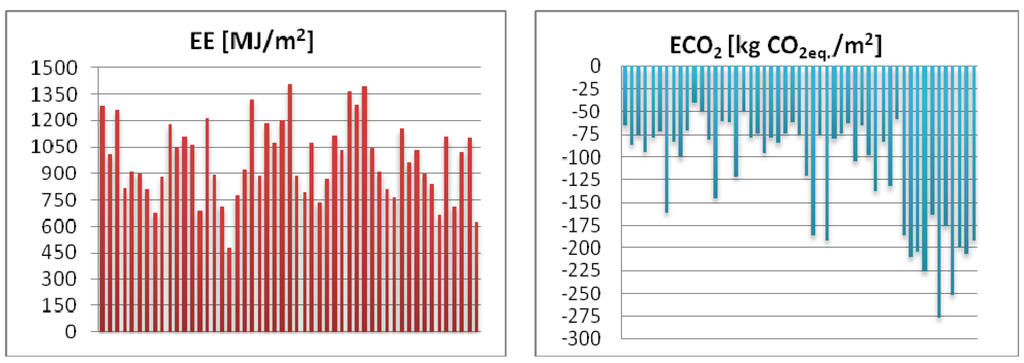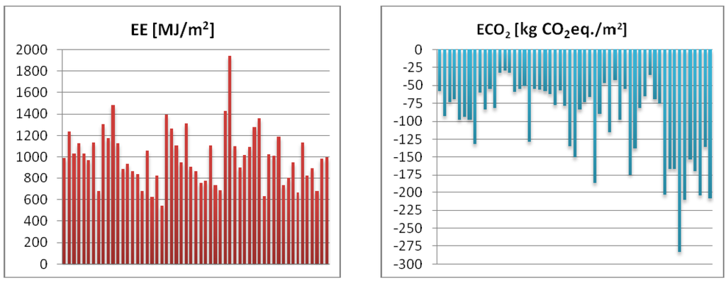 Environmental analysis of the life-cycle impacts of a single-family house demonstrated that exterior walls were by far the most significant construction component, with 35% of EE and 43% of CO2eq emissions associated with the construction phase [13]. The embodied environmental impacts such as EE are not considered in current requirements for new buildings. Embodied impacts of building materials and components achieve high values, especially in the case of extremely energy-efficient dwellings. The appropriate selection of building materials during the design process plays a significant role during the life cycle of a building and can affect the sustainability of the project [3]. For dwellings designed according to conventional energy standards, EE is equivalent to a few years of operational energy [14].