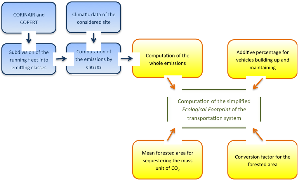 Figure 1 depicts the logical steps leading to the computation of the simplified ecological footprint of a given transportation system.