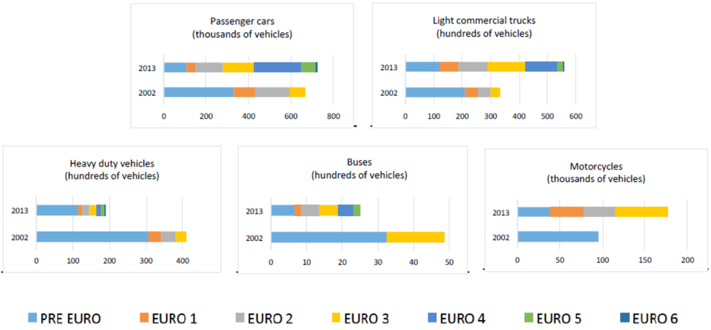 Figure 2 refers to the running fleet of the Province of Palermo: in particular, the changes in the composition of the running fleet are shown for the years 2002 and 2013. These years have been selected due to the technical changes occurring in this period in the fleet, that led to significant modifications in the emitting properties of pollutants released by vehicles. In Figure 2, classes of vehicles and emitting categories are those contemplated within the COPERT methodology.
