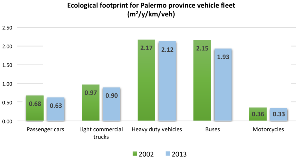 In fact, the simplified version of the ecological footprint methodology is here applied to the transportation system of the Palermo province with the aim of singling out the equivalent surface of bio-productive land needed for sustaining the urban mobility system. The results of these calculations, for years 2002 and 2013, are summarised in Figure 3 in terms of surface of forested area needed for sequestering the CO2 emissions of this transportation system. Figure 3 refers to the footprint of each representative vehicle of all emitting categories.
