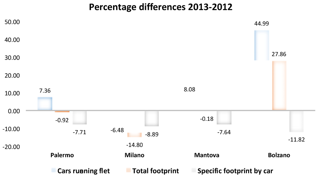 When the performances of the average cars are combined with the total numerical consistence of the running park, one obtains an immediate view of the whole outcome of the provinces. Figure 5 illustrates these results, showing that, for the period between years 2002 and 2013, Milano reached the best position, with a decrease of almost 15%. Palermo and Mantova have shown a small decrease (respectively, −0.92% and −0.18%), while Bolzano, due to the enormous growth of its fleet, registered an increase of about 27% of the ecological footprint.