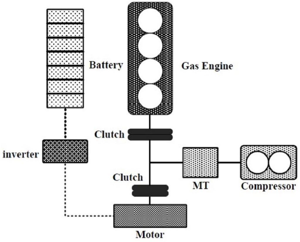 Figure 1 shows a diagram of a coaxial parallel-type HPGHP system, which has two power sources: the engine and the motor. Both the engine and motor can run separately or together to drive the heat pump system. The motor, used as a generator or an electric motor, can work together with the engine under different apertures of the throttle, which can adjust the engine real-time speed and torque to maintain the engine running in the economical zone. The MT in Figure 1 is the manual transmission and the transmission ratios in different modes are 2, 1.6, and 3, respectively.