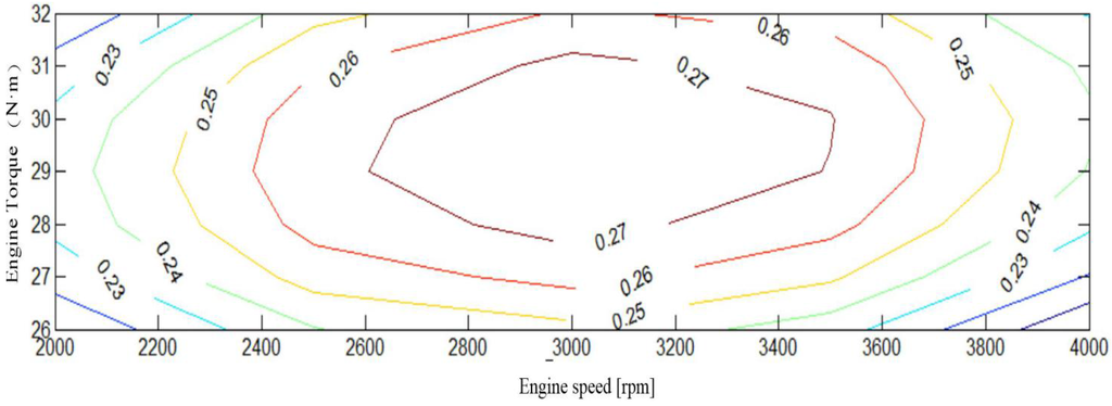 The maximum output power of the engine is 12.5 KW, the maximum torque is 31.9 Nm, the highest thermal efficiency is 0.279 and the rated speed is 2900–3100 rpm. The thermal efficiency map of the engine is shown in Figure 2.